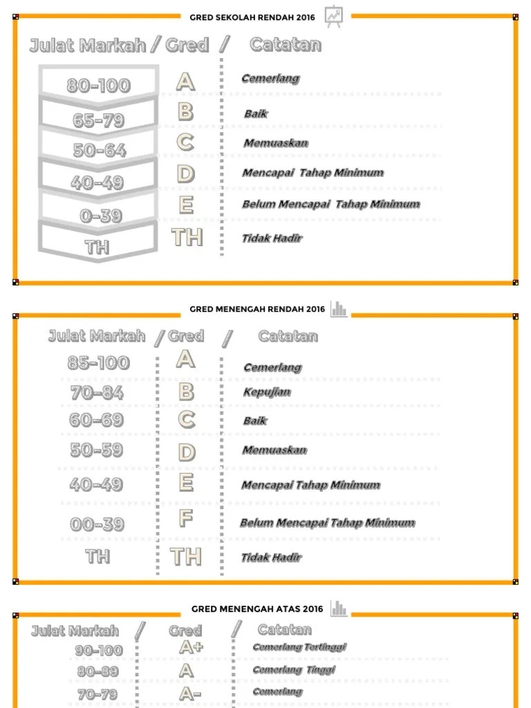 Gred markah peperiksaan (upsr, pt3, spm, stam, stpm), sistem gred pemarkahan keputusan peperiksaan spm, pt3, upsr, julat gred markah peperiksaan sekolah .